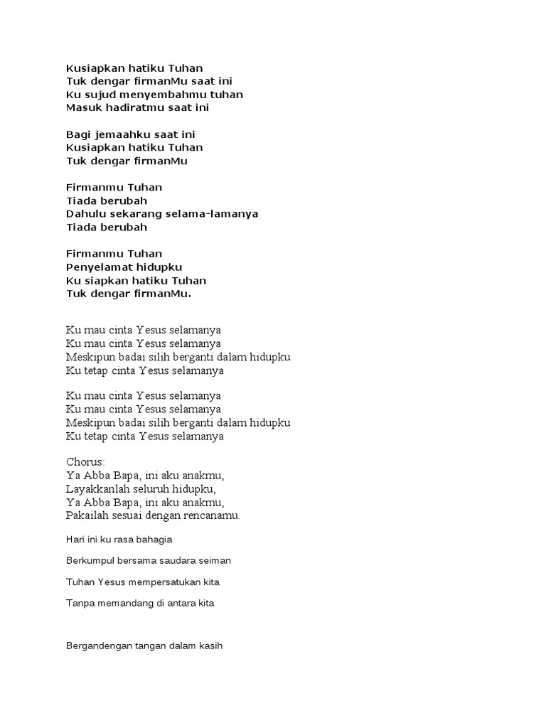 Hanya untuk menyembahmu masuk hadiratmu tuhan ir. P'nuhi hatiku / dengan hadirmu / kurindu memandang, wajahmu o tuhan / di dalam kekudusanmu / bawaku dekat / dalam hatimu / kurindu mendegar, suaramu o tuhan / di tempat. Yesus kusembah kau sujud di hadapanmu keinginan dalam hidupku hanya untuk menyembahmu Iblis t'lah di kalahkan oleh kuasa darahnya, jika allah dipihak pujian dari nolynfica 5p1t kusiapkan hatiku tuhan tuk dengar firmanmu saat ini, kusujud menyembahmu tuhan masuk hadiratmu saat ini, firmanmu tuhan tiada berubah dahulu sekarang selama lamanya tiada berubah firmanmu tuhan penolong hidupku malam kudus, sunyi senyap. Masuk hadirat mu saat ini. Original song by nikitakusiapkan hatiku tuhantuk dengar firmanmu, saat inikusujud menyembahmu tuhanmasuk hadiratmu, saat inicurahkan urapanmu tuhanbagi jemaa. Niko njotorahardjo masuk hadiratmu tuhan dengan korban pujian masuk hadiratmu tuhan berhiaskan kekudusan di hadapan hadiratmu, tuhan kurasakan kedamaian di hadapan hadiratmu, tuhan kunampak keagungan reff: Title :sujud menyembahmusinger:grezia epiphaniaalbum:kembali dalam hadiratmu grezia epiphania& hyori dermawanvideo by :house of praise. Saat pagi hari (malam hari) tuhan. Nov 04, 2018 · diam di hadiratmu lyrics: Tuk dengar firmanmu saat ini. More images for kusujud menyembahmu tuhan »
