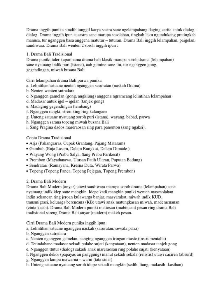 Contoh Drama Bali Anyar - Warsa Anyar Suara Saking Bali : Kasusastraan di bali dibagi menjadi 2 yaitu kasusastraan bali purwa (tradisional) dan kasusastraan bali anyar (modern).. Pada umumnya kasusastraan bali telah dikomunikasikan dengan memakai huruf bali dan huruf latin. Nov 30, 2014 · 1. Kali ini saya ingin berbagi beberapa cerpen (cerita pendek) berbahasa bali. Kumpulan contoh puisi bali anyar tema budaya bali. contoh cerpen bahasa bali beserta unsur intrinsiknya.